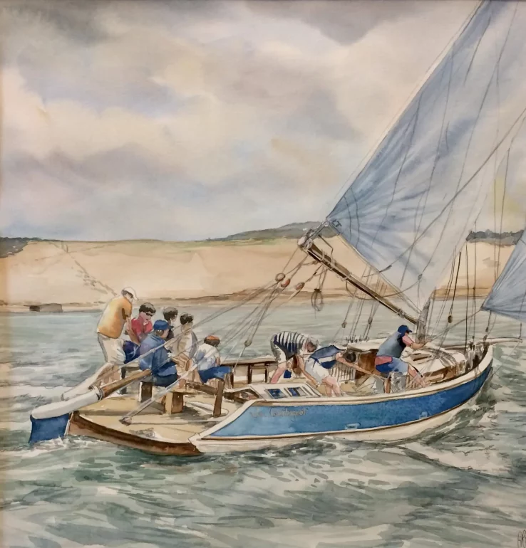 Bruno Roul-Gauffin fait partie des artistes que l’on associe immédiatement au Bassin d’Arcachon. Ses aquarelles, entre vieux gréements et paysages marins, révèlent une maîtrise technique solide et un sens du détail qui rend les scènes presque vivantes. Globe-trotter dans l’âme, il peint aussi la montagne, l’Antarctique ou l’Amérique latine, mais revient toujours à ce fil rouge : la mer, les bateaux, et l’histoire maritime.