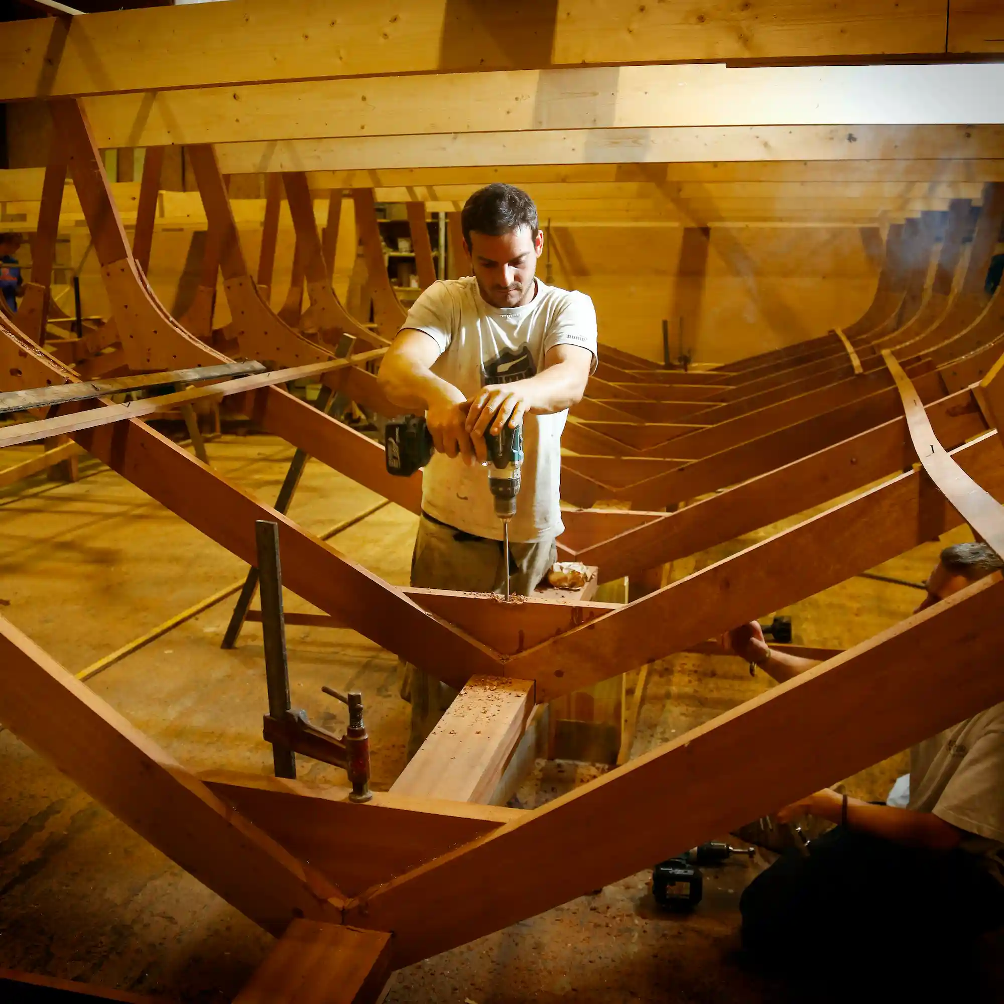Ce qui frappe encore, ce sont les hommes qui y travaillent, chacun de leur côté mais tous ensemble. Ils font œuvre commune. De la feuille blanche initiale jusqu’au départ du navire, ils sont de toutes les tâches. Main dans la main, ils taillent, poncent, assemblent, façonnent… Les gars de Dubourdieu, le chef Benjamin, dit Kador, Florent son second, Guillaume, Nicolas, David, Yann, Arthur… composent à eux tous un orchestre. Menuisier, charpentier ou les deux, ils jouent la plus belle des partitions. Conscients d’exercer un métier précieux dans un lieu unique.