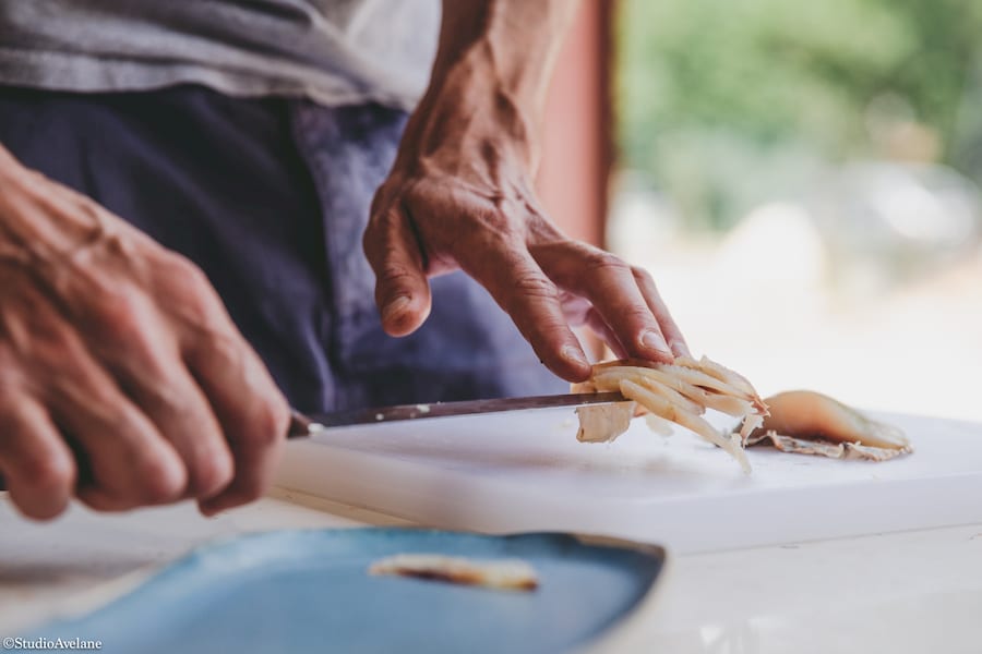 Toutes les étapes de transformation sont exclusivement manuelles, de l’écaillage au désarrêtage à la pince à épiler. Le poisson est ensuite salé à la main avec du sel de l’Ile de Ré par frottage. Sel qui va agir comme une cuisson permettant de se conserver plus longtemps et d’éliminer les bactéries. Après un rinçage à l’eau, le poisson subit une phase de séchage en chambre froide avant la fumaison, étape primordiale.