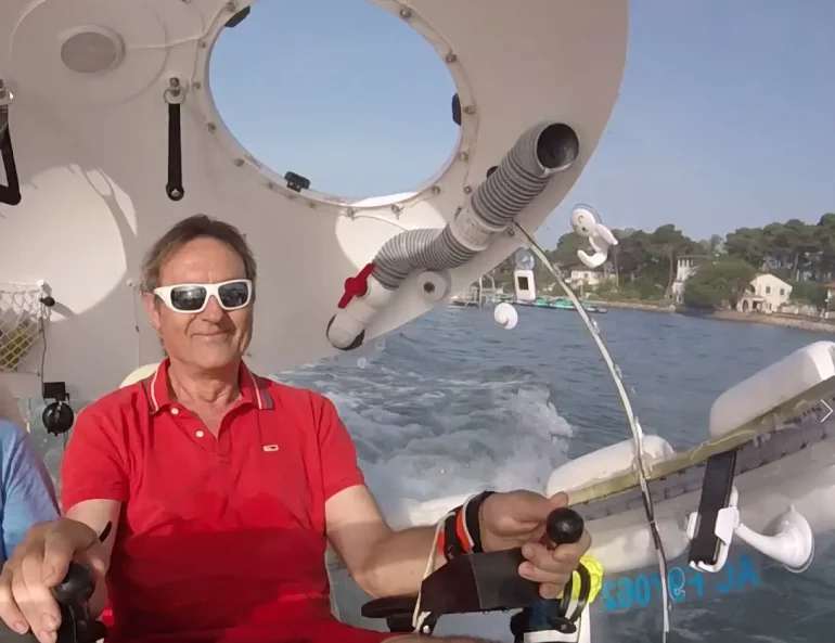 Installé sur la presqu’île, à Petit Piquey, l’inventeur a imaginé un navire rond “comme une balle de ping-pong”. Son idée de départ paraît simple : dans une tempête, quoi de plus solide qu’une forme sphérique, capable de suivre le mouvement des vagues sans se briser ? Restait à transformer ce concept en bateau réel. Des années de tests et d’expérimentations ont été nécessaires avant de voir l’engin naviguer sur le Bassin d’Arcachon.