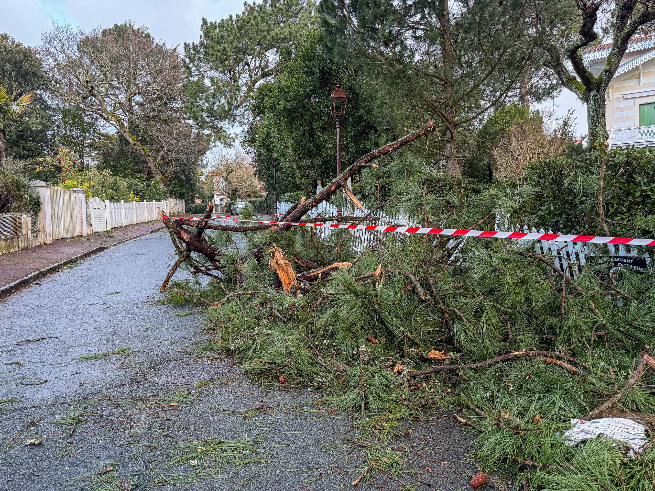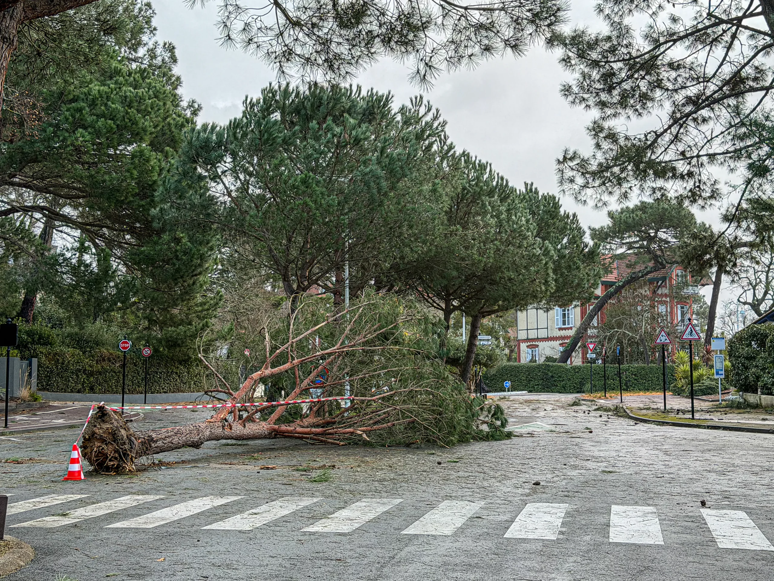 Bilan des dégâts constatés ce matin : aucune victime, mais d’importants dégâts, notamment dus aux fortes précipitations, aux vents très violents et à des sols très humides. On note des coupures de courant et beaucoup d’arbres couchés sur la route à Arcachon (Ville d’hiver), à Gujan-Mestras (route des lacs et avenue de Césarée), du côté du Pyla, à La Teste, à Salles, à Biganos devant l’église, ainsi que de nombreuses voies inondées. Pas mal de dégâts aussi au port d’Arcachon.